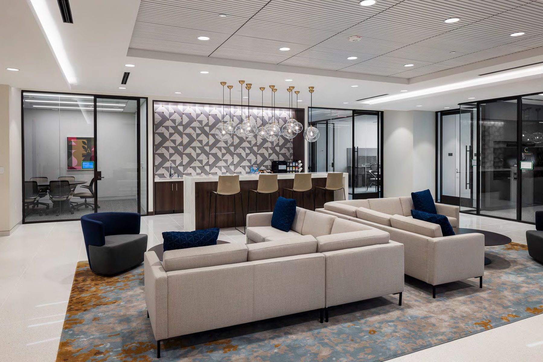 Keeley is currently in the process of this total rehab project to bring the local Morgan Stanley office into alignment with the corporate brand standards. The project consists of a multi floor, multi-phase construction project renovating a total of 26,400 SF in total. The newly renovated spaces include 58 private offices, 63 large open format workstations, multiple conference rooms, and a Seminar area for larger gatherings. In addition to the working space for the renovation, several areas for employee comfort and productivity have been provided. Huddle spaces for quick collaboration between team members, Focus areas for one-on-one interactions, a remodeled Employee hub featuring multiple beverage and food offerings. The modern finish combination of wood, tile, and carpet all blend very well with the glass office fronts and modern feel to this remodel.
