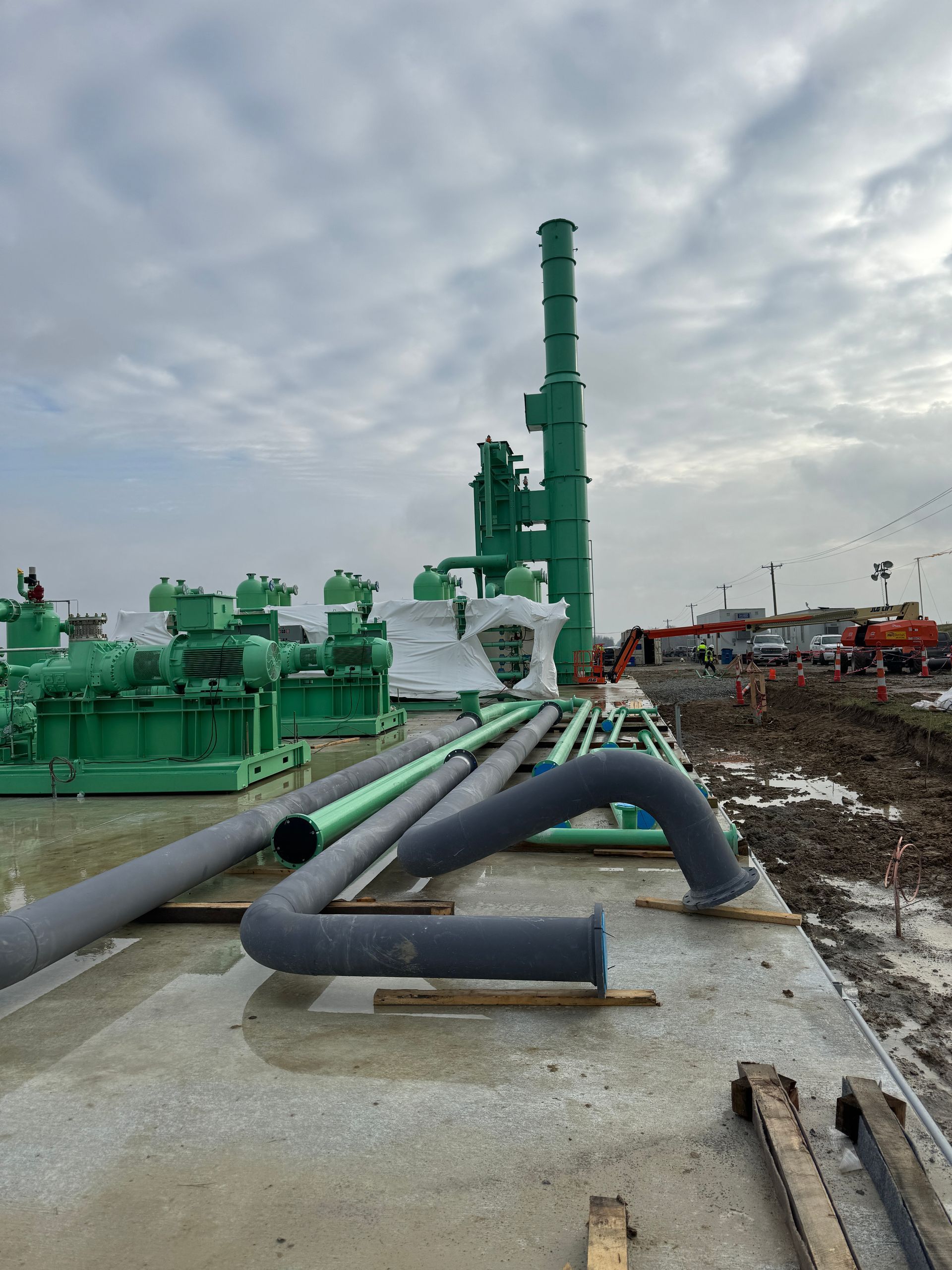 Keeley Construction was contracted to perform all field installation and management activities for the development of three 3600 SCFM and one 6400 SCFM Renewable Natural Gas Facilities in Ohio, Michigan, Kentucky, and Indiana. The feedstock for the facility was a landfill gas collection system. Keeley was responsible for all activities from initial sitework development, concrete installation, steel erection, equipment installation, process piping, electrical & instrumentation installation, and commissioning. The project included dual wall HDPE condensate systems, 18” & 24” Landfill Gas Piping, stainless & carbon steel welding, and process tubing. Main equipment installations included: H2S System, LN2 System, Thermal Oxidizer (TOX), NRU (Nitrogen Recovery) & Absorbers, TSA, Membrane Filtration, Sales Compression, Vacuum Compression, 1st/2nd Stage Feed Compression, Recycle Compression, Methane Deoxidization, and Off-Spec Flare.